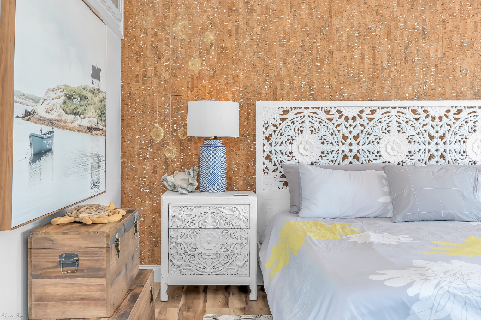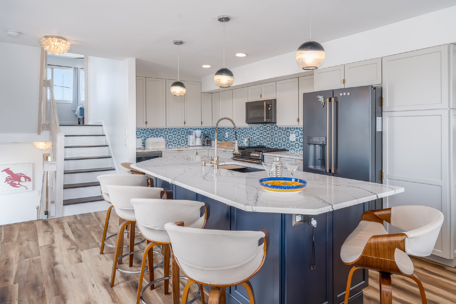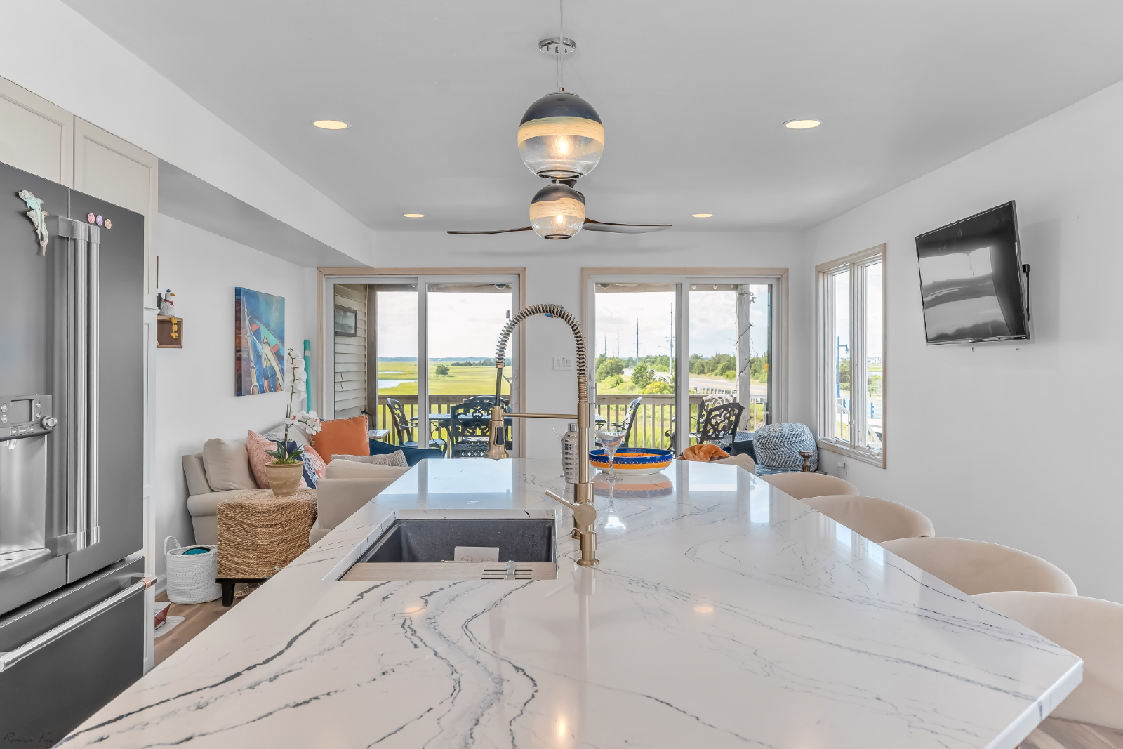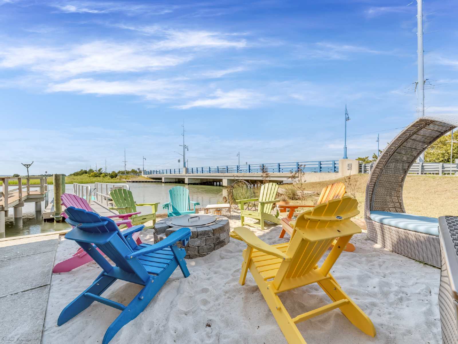 On the lower level, you'll find a bedroom (Queen), plus a second bedroom (Queen) that is bay front with sliding glass doors that lead to the patio, where you can lounge (or snap Insta-worthy pics) in the brightly colored hanging basket chairs overlooking the bay. A full bathroom with a spa-like shower, and full-size washer and dryer complete this level. Up one set of stairs is the third bedroom (1 Full, 1 Twin), and shared full bath. Next stop: your main living level: a stunning open kitchen with large island for dining and gathering...which flows into the living room. The living space is accented by two sliding glass doors that afford stunning bay views, and quick access to the outdoor dining table on the covered deck. Next up: bedroom 4 (1 Full, 1 Twin), with a desk, and stylish en suite bathroom. Finally, the top floor is dedicated to the primary suite that boasts a King bed, beautiful modern bathroom with large shower and double vanity, plus glass doors that take you to your own private deck with generous space to lounge and soak up the priceless sunsets. The outdoor space is equally impressive and thoughtful: with a fire pit, outdoor shower, and plenty of dock space to enjoy the best of waterfront living. Note: this home does NOT have a grill.