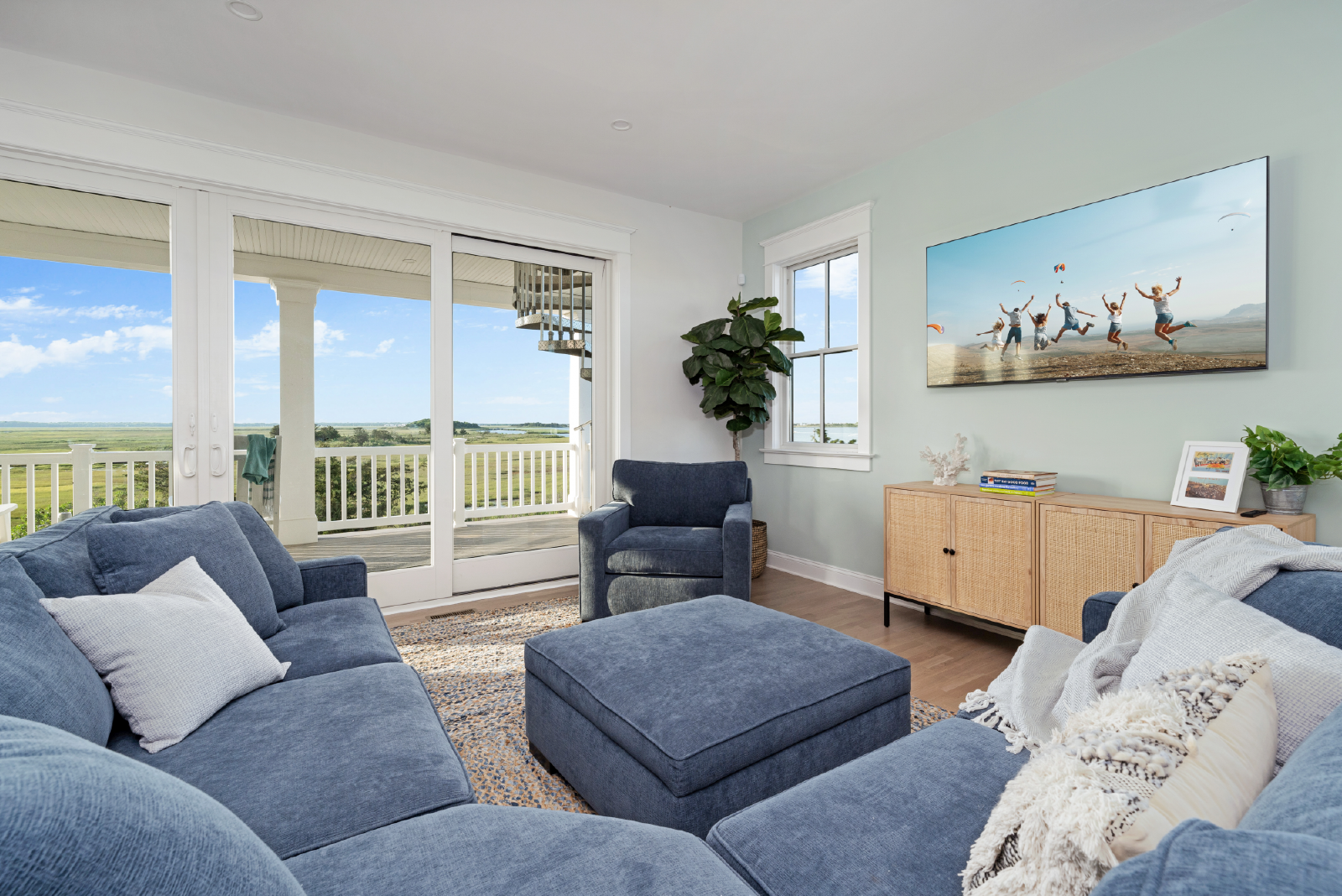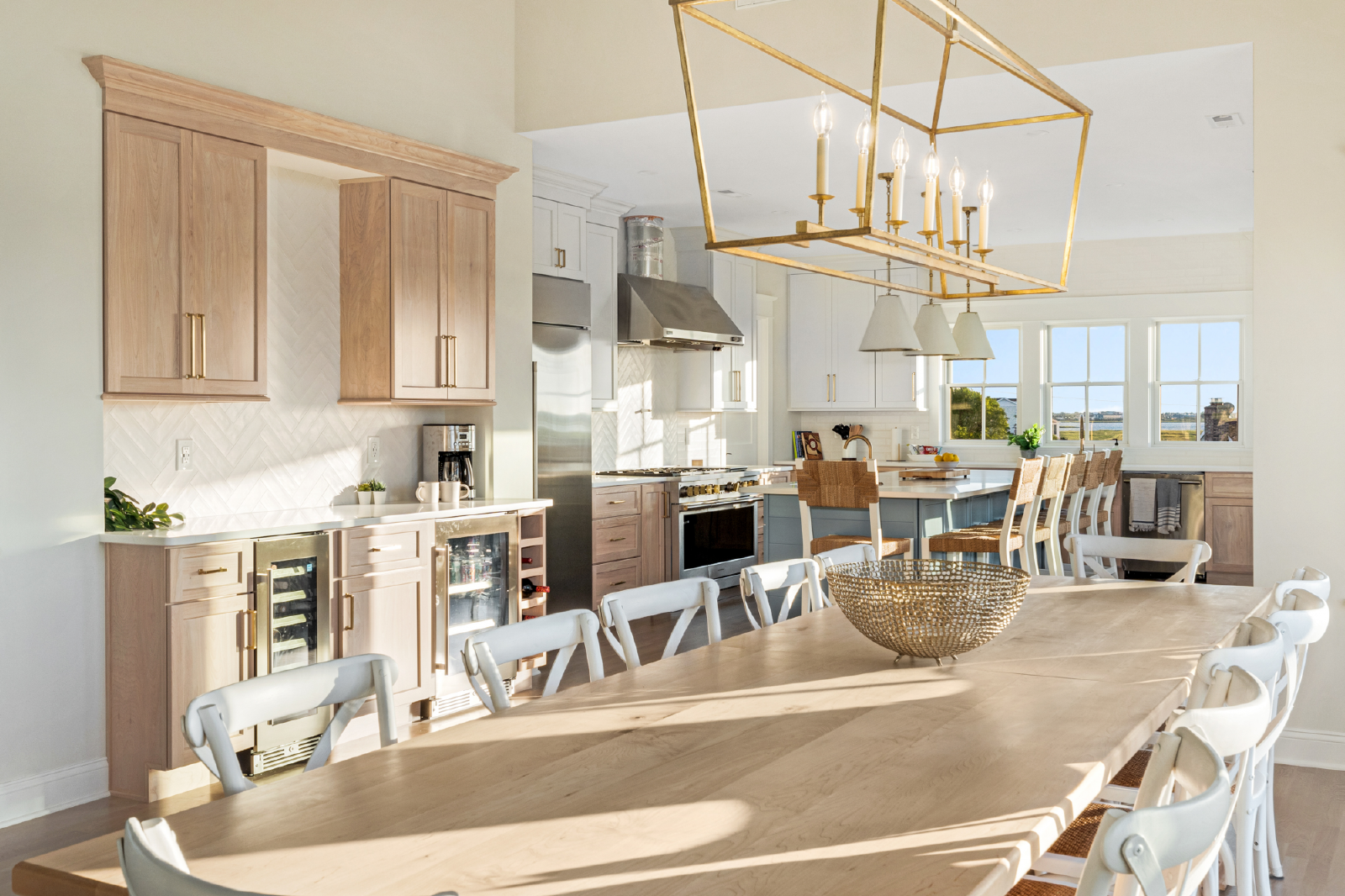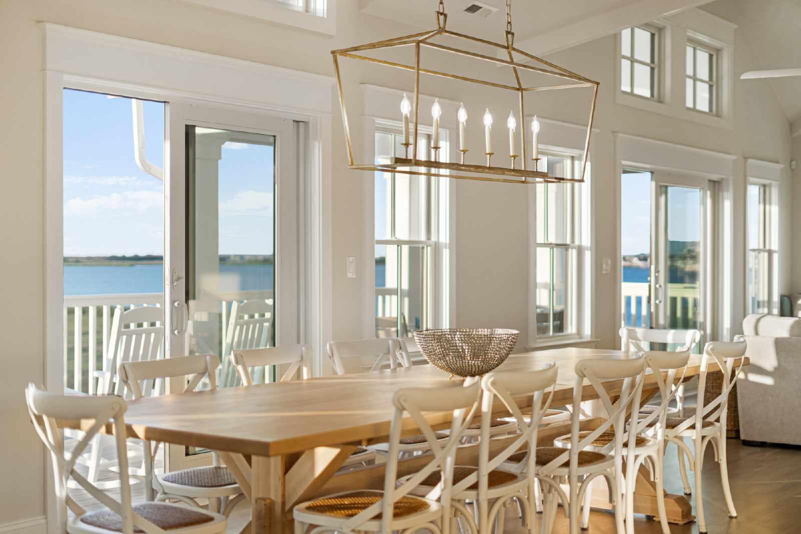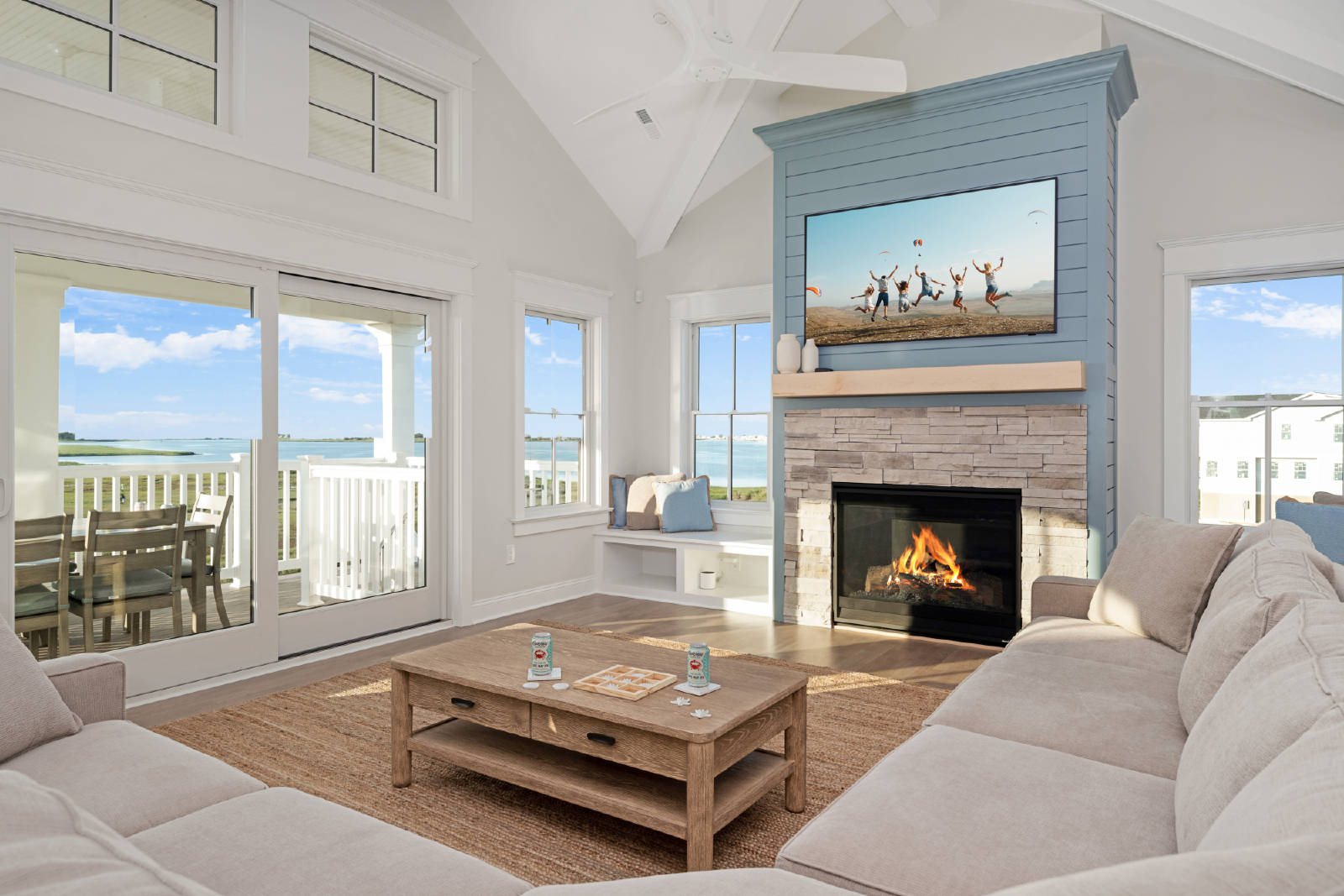 The living room features a large TV, sectional sofa, gas-burning fireplace and opens to a 10-person dining table as well as seating for 6 at the large kitchen island. All of this is overlooking the endless bay views and unrivaled sunset views.