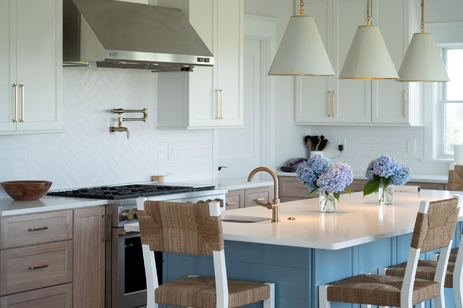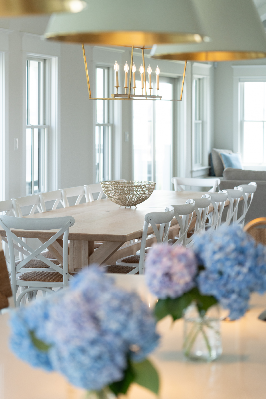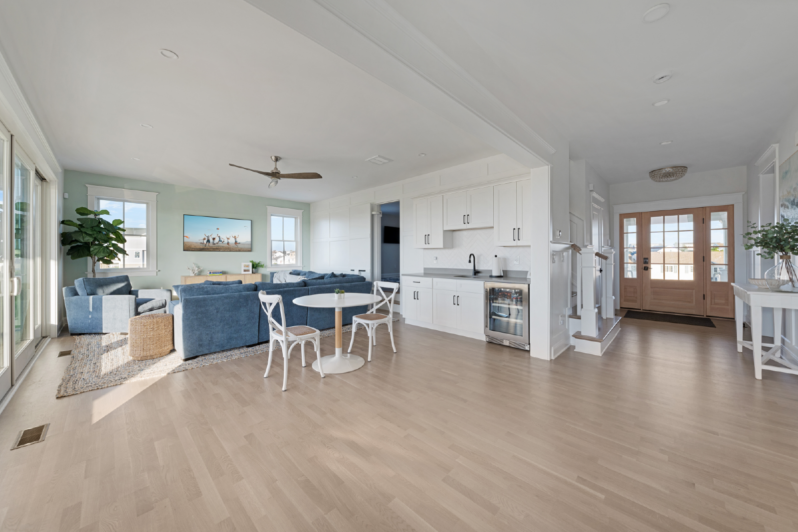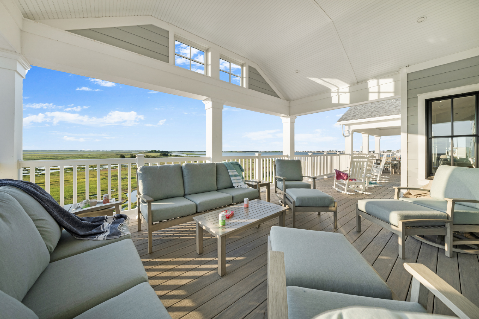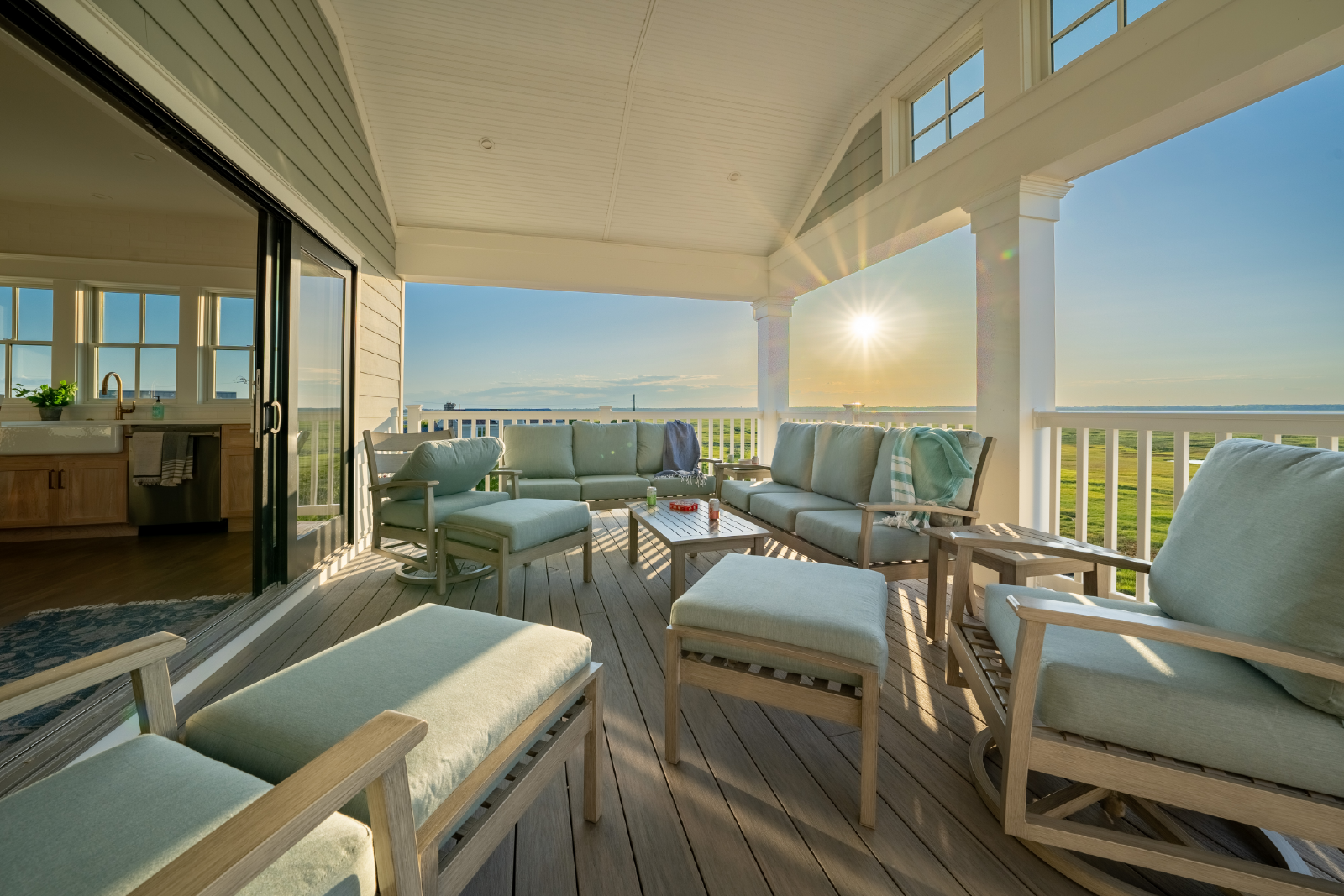 The living room features a large TV, sectional sofa, gas-burning fireplace and opens to a 10-person dining table as well as seating for 6 at the large kitchen island. All of this is overlooking the endless bay views and unrivaled sunset views.