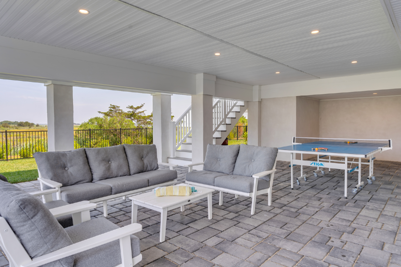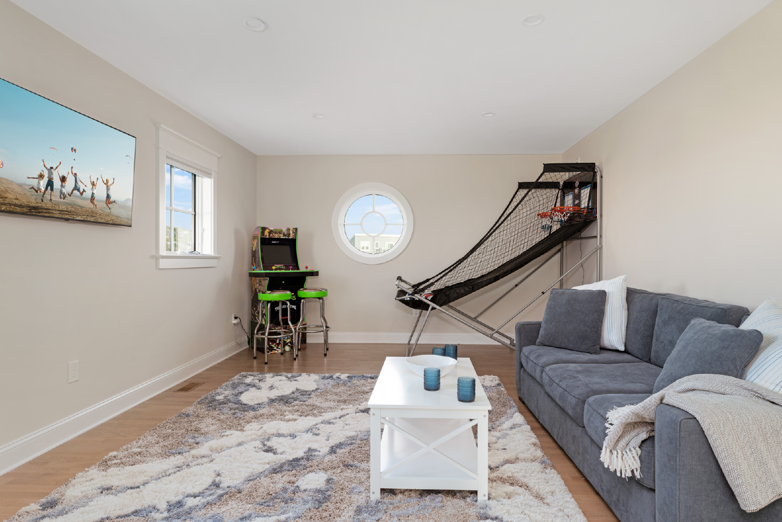 The first-floor features 4 bedrooms, 3 full bathrooms, a laundry room, second story deck, and a large living room which opens to a separate "secret" game room offering plenty of space to hang out, enjoy an arcade game and basketball, and for kids to play.