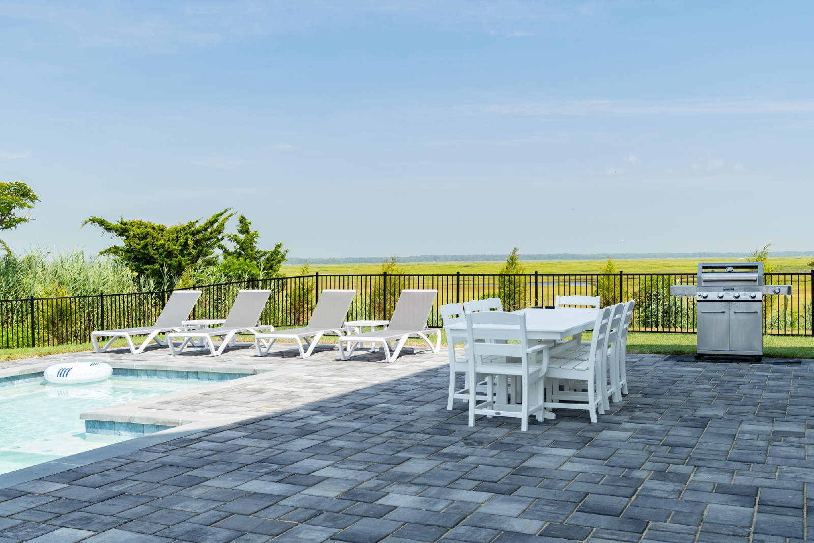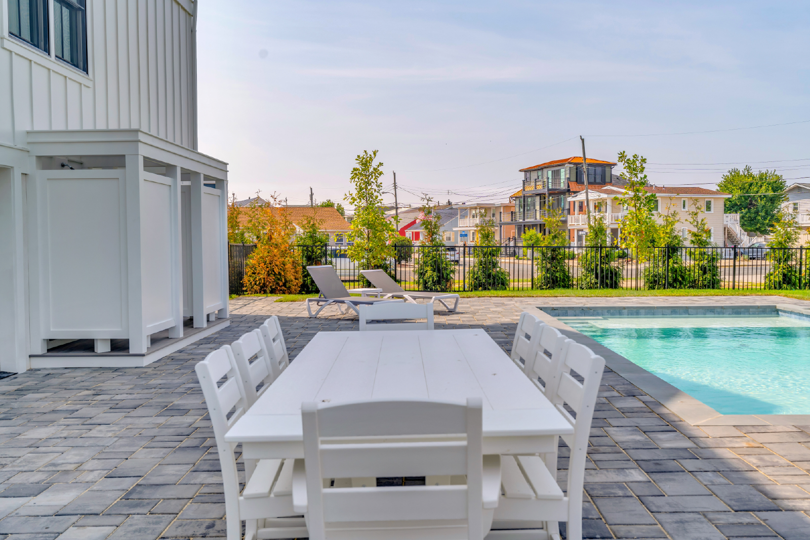 The pool area features an in-ground heated pool with bench seating and a sun shelf as well as plenty of space to lounge, relax and enjoy the beautifully landscaped fenced-in yard lined by mature trees and paver patio space. There is a ground floor powder room, 2 outdoor showers, BBQ gas grill, and a covered patio area for dining and lounging. Parking is convenient, offering a garage, plus space for 2 additional cars in the driveway, and plenty of free street parking right out front.
